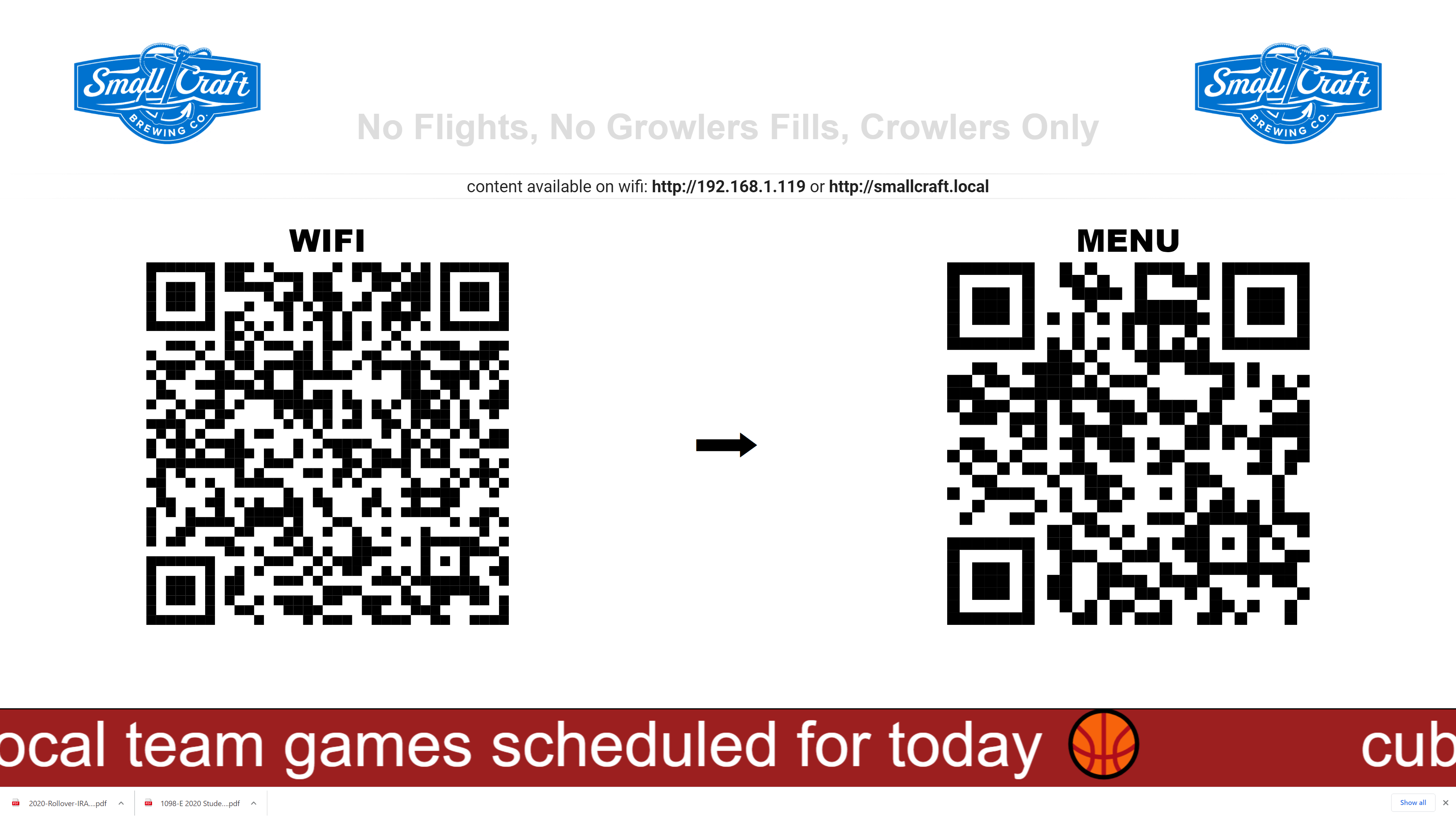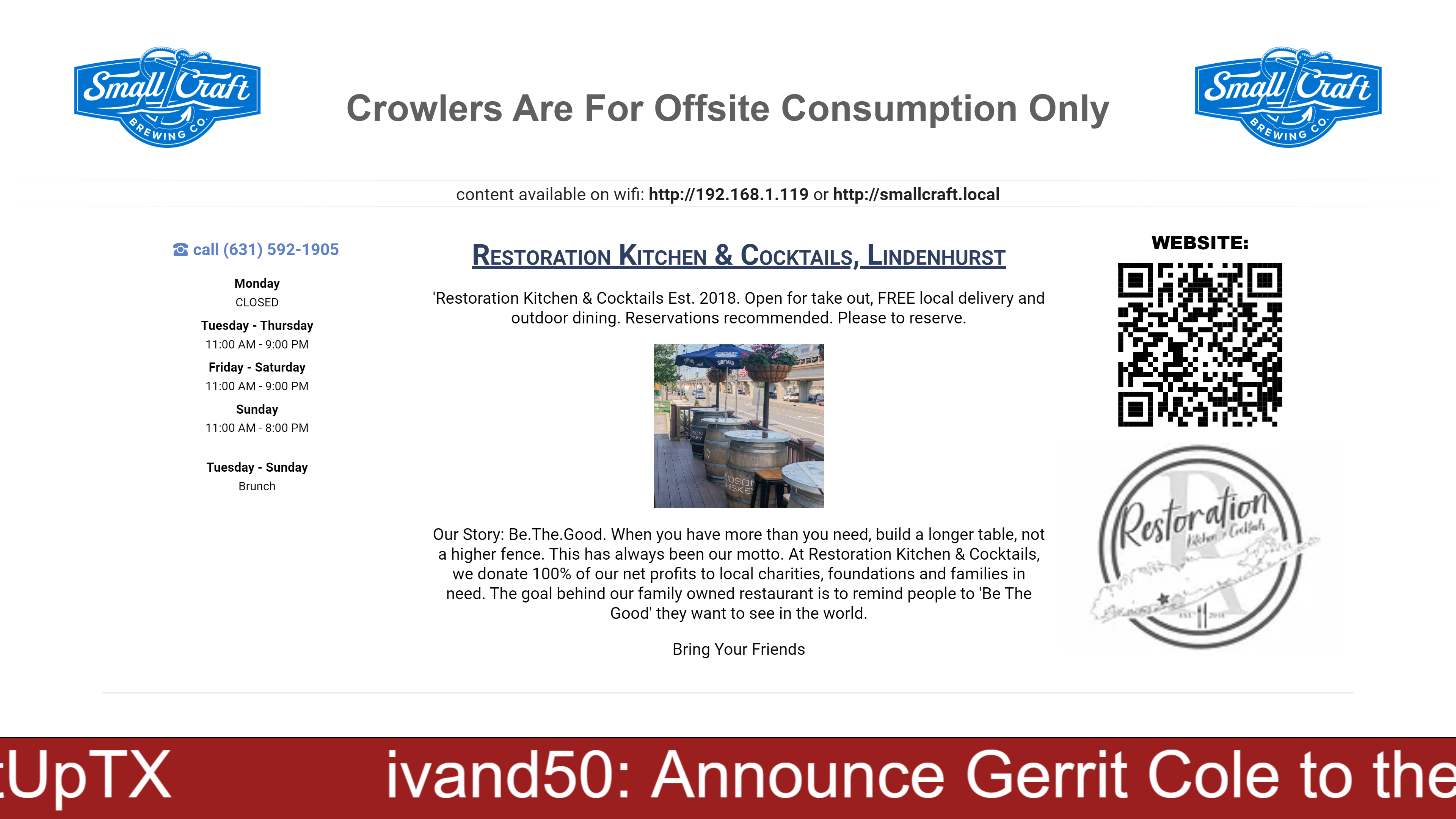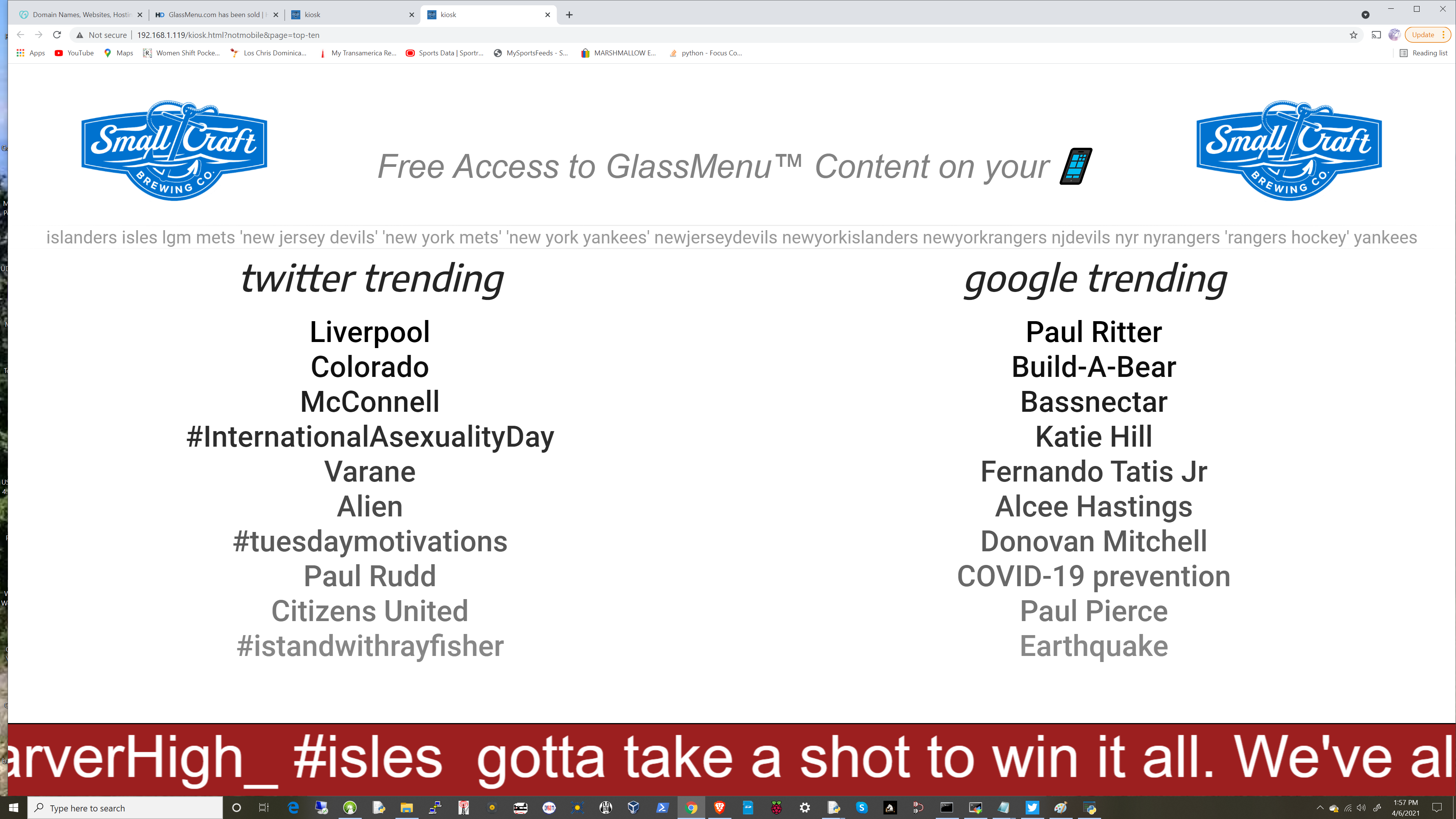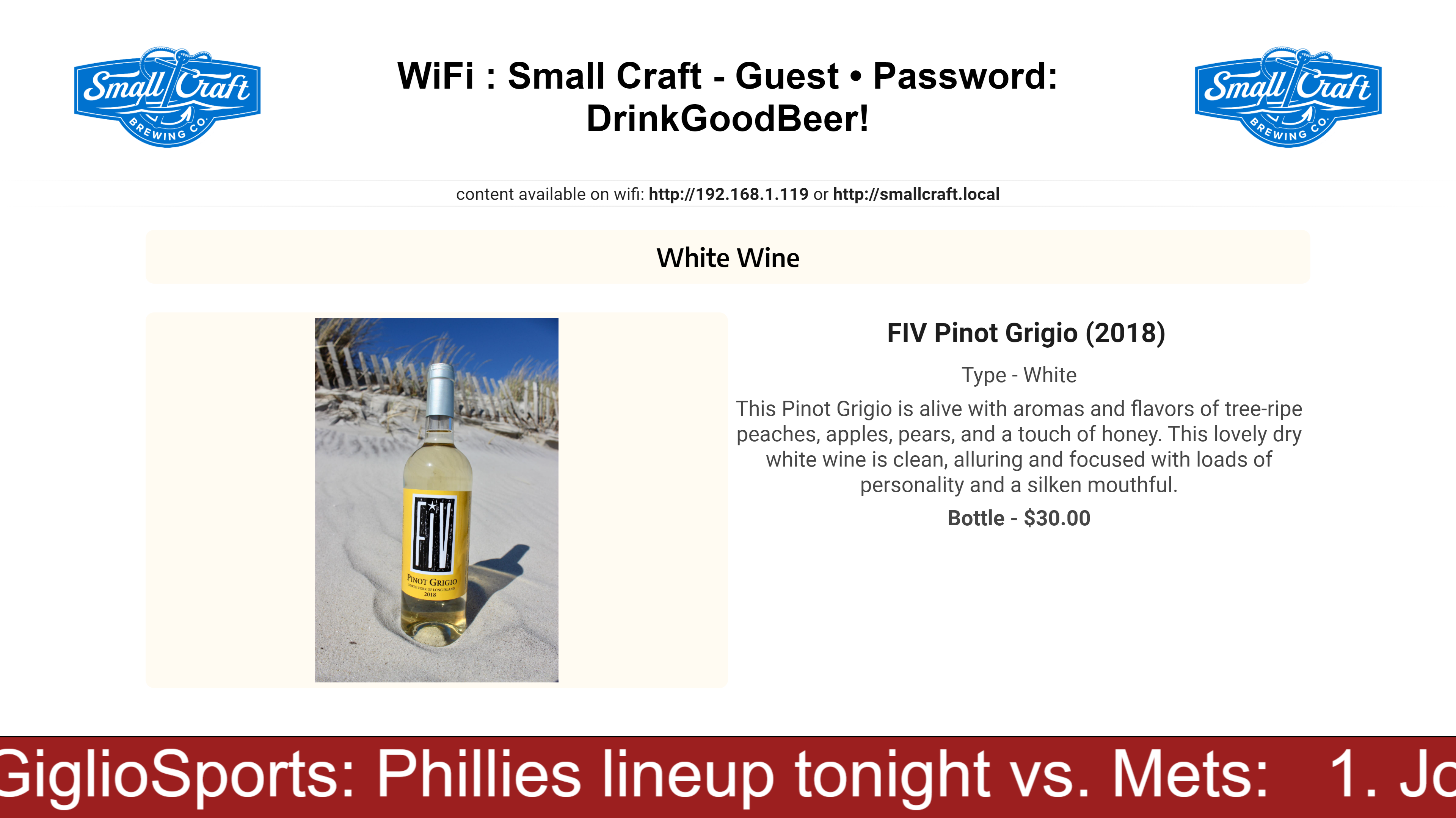 Glassmenu™ is a next-generation, touch-free* interactive digital display technology that showcases your store’s unique content on both large screens and smartphones. Web based entertainment feeds like “Top 10” Twitter and Google trending topics are built-in as seen above. Any walk-in retail venue such as a supermarket, craft brewery, restaurant, sports bar, hotels, medical/ veterinary offices are a good fit for this innovative product. Set up takes minutes, and we ship you a pre-configured “plug and play” mini server that plugs into your router. You can alert your customers to your “specials of the day” as soon as they enter your venue. Or feature your services or menu in a revolving display format. All content displayed on the big screen is clickable by your customers on their smartphones via standard wifi using our built-in high performance web server. Customers see complete product menus by category on their smartphone in an easy to navigate format. Android and Apple smartphones are fully supported.